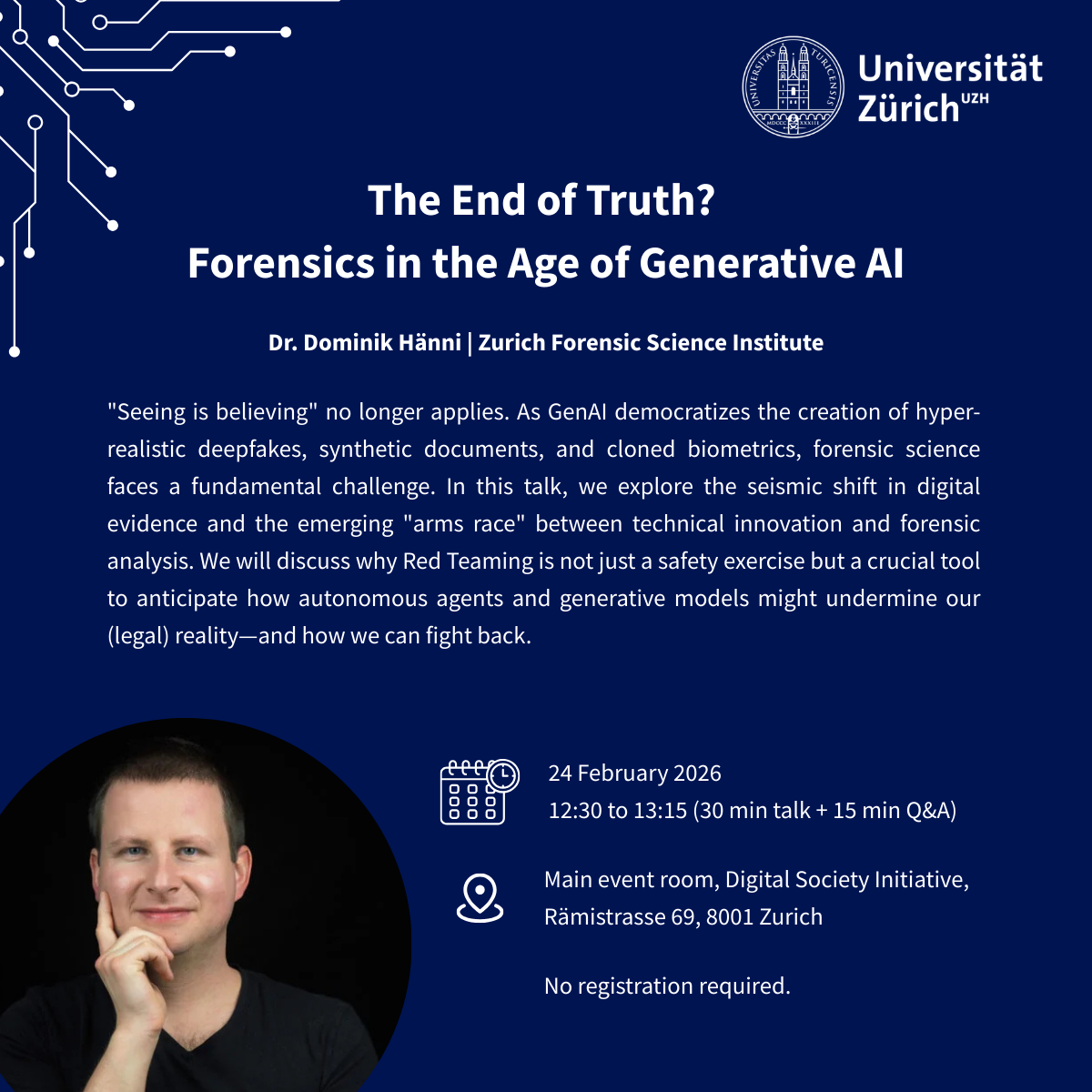 «Seeing is believing» no longer applies. As GenAI democratizes the creation of hyper-realistic deepfakes, synthetic documents, and cloned biometrics, forensic science faces a fundamental challenge. In this talk, Dr. Dominik Hänni from the Zurich Forensic Science Institute will explore the seismic shift in digital evidence and the emerging «arms race» between technical innovation and forensic analysis. He will discuss why Red Teaming is not just a safety exercise but a crucial tool to anticipate how autonomous agents and generative models might undermine our (legal) reality—and how we can fight back.