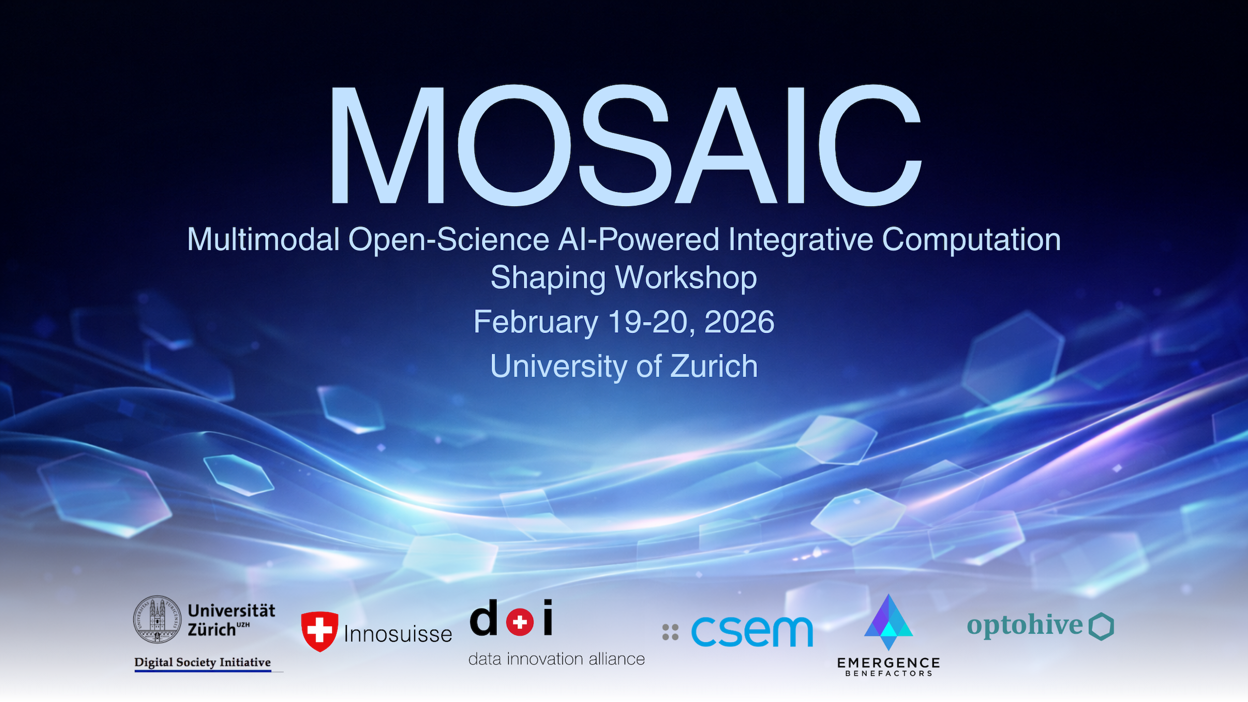 The MOSAIC Shaping Workshop «From fragmented multimodal studies to scalable multimodal science infrastructure» brings together leading experts from neuroscience, multimodal AI, research infrastructure, clinical research, and innovation to: