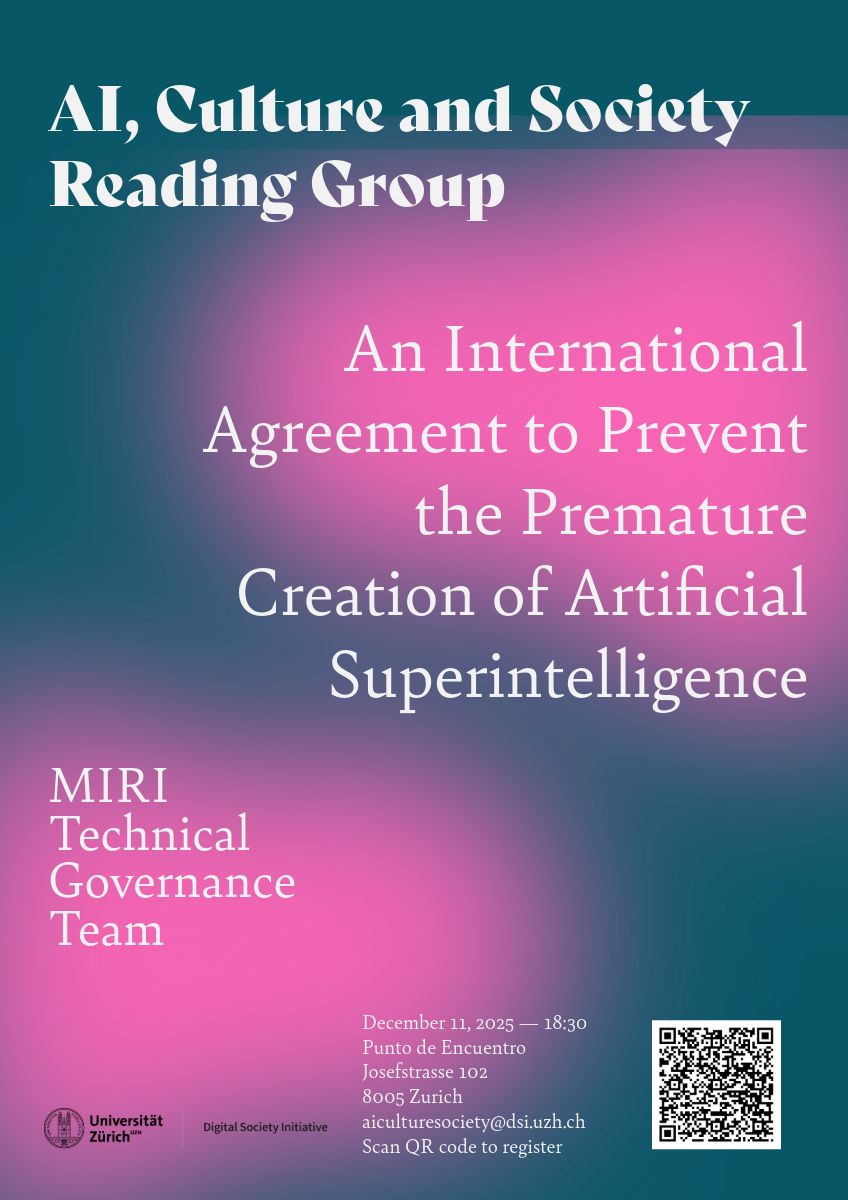 The next reading group event of the DSI Community AI, Culture & Society will focus on a short blog post from the MIRI Technical Governance Team at the Machine Intelligence Research Institute (MIRI), about a new policy report proposing an international agreement to halt progress toward artificial superintelligence.